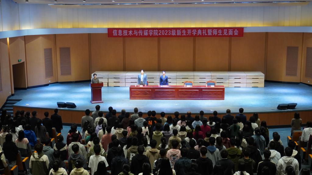 典礼在庄严雄壮的国歌声中拉开序幕。网络与新媒体教研室主任李文学博士作为教师代表发言,勉励同学们坚定理想信念、筑牢信仰之魂,以饱满的精神面貌开启新征程;广播电视学201班唐琦同学与全体新生分享了自身学习成长之路,鼓励新同学们怀揣梦想、脚踏实地、敢想敢为、奋发图强;数字媒体艺术231班常曾雲同学代表新生向全体老师致以真挚的感谢和崇高的敬意,希望同学们不忘初心、持之以恒,脚踏实地、努力奋斗,心系家国、胸怀天下,再创新的辉煌。