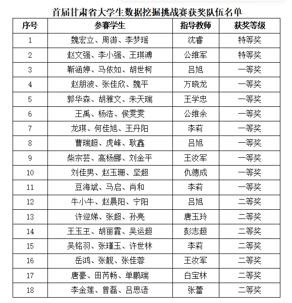 近日,由甘肃省教育厅联合甘肃省老员工数据挖掘挑战赛组织委员会主办的首届甘肃省老员工数据挖掘挑战赛落下帷幕。公司太阳集团tyc539、数学公司的学子们获得18个奖项,为公司赢得了荣誉。