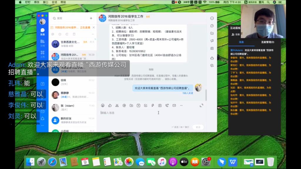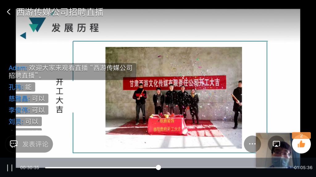 招聘会依托“陇政钉”政务移动办公平台,通过线上直播模式进行。宣讲环节,用人单位全面介绍了公司概况、组织架构、发展历程、工作环境、招聘岗位、薪资待遇、未来战略目标等内容,展示了公司近5年与各大高校、企事业单位合作完成的各类项目宣传片和影视作品,并提供了摄影、短视频制作、后期剪辑等6个就业岗位。交流环节,员工们积极提问,就普遍关注的福利政策、晋升机制、发展空间等细节问题进行了详细咨询和互动交流。